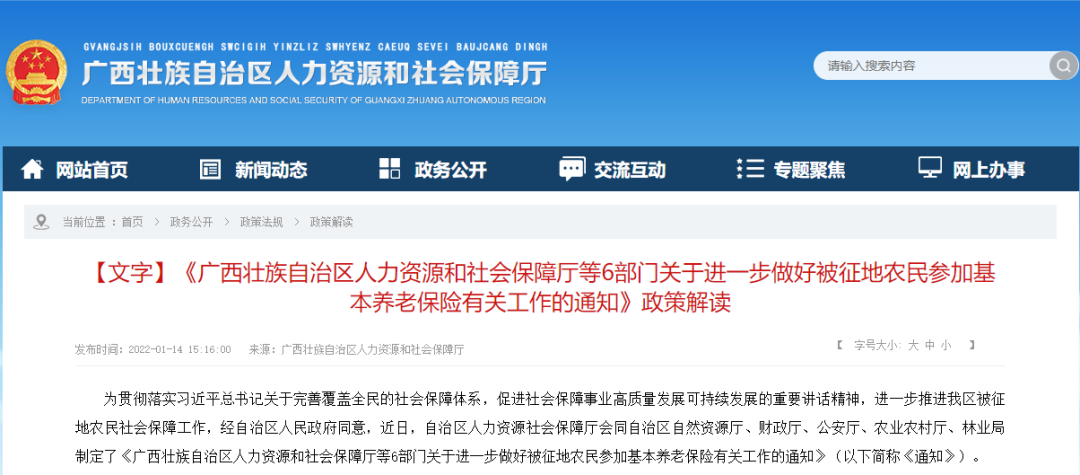 为贯彻落实习近平总书记关于完善覆盖全民的社会保障体系,促进社会保障事业高质量发展可持续发展的重要讲话精神,进一步推进我区被征地农民社会保障工作,经自治区人民政府同意,近日,自治区人力资源社会保障厅会同自治区自然资源厅、财政厅、公安厅、农业农村厅、林业局制定了《广西壮族自治区人力资源和社会保障厅等6部门关于进一步做好被征地农民参加基本养老保险有关工作的通知》(以下简称《通知》)。