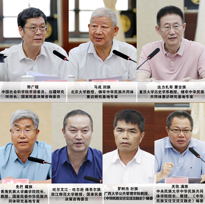 中国社会科学院学部委员邢广程、北京大学教授马戎(回族)、复旦大学教授达力扎布(蒙古族)、青海民族大学教授先巴(藏族)、浙江师范大学教授吐尔文江·吐尔逊(维吾尔族)、广西大学教授罗树杰(壮族)、中央民族大学教授关凯(满族)等7位学者发言,就中华文明五大特性与铸牢中华民族共同体意识、在实事求是基础上坚定中华民族的文化自信、中华文明的统一性与包容性、青藏高原是中国古代文化“场”中重要区域之一、建设中华民族现代文明与中华民族共同体是文化润疆的重要方向、壮族文化的形成发展是中华文明五大特性的生动体现、中华民族现代文明与中华民族共同体建设等多方面畅谈学习体会。大家一致认为,习近平总书记在文化传承发展座谈会上发表的重要讲话,阐明了中华文明的突出特性,揭示了“两个结合”的深刻内涵,强调了建设中华民族现代文明的重要原则。中华文化是各民族优秀文化的集大成,各民族共同创造了伟大悠久的中华文明,中华文明的突出特性在各民族文化中都有体现,国土不可分、国家不可乱、民族不可散、文明不可断是所有中华民族成员的共同信念。大家一致表示,要以习近平总书记重要讲话精神为引领,牢牢把握中华文明的五大突出特性,深入开展理论创新,多出高质量研究成果,为中华民族现代文明建设和中华民族共同体建设作出积极贡献。