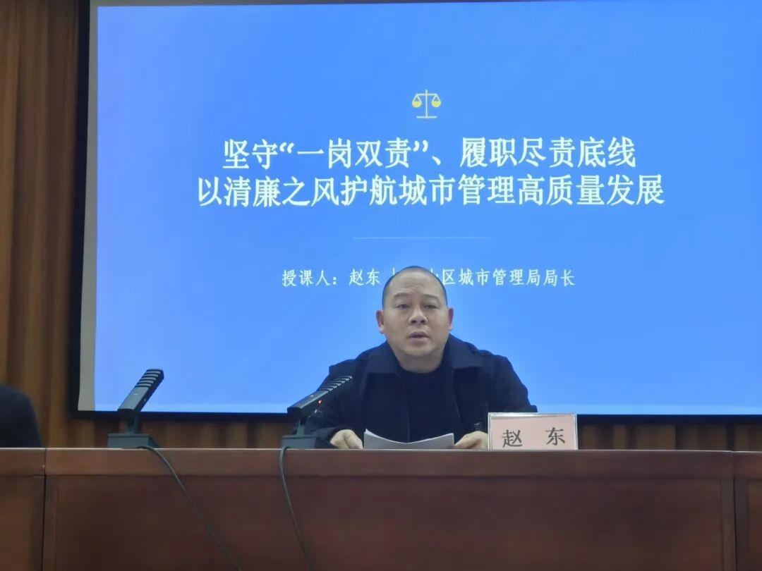 随后,区城管局局长赵东以“坚守‘一岗双责’、履职尽责底线,以清廉之风护航城市管理高质量发展”为题开展廉政教育。他提出三方面要求:一是在执法监管中坚守公正底线,严格执行执法公示等“三项制度”,规范裁量标准,杜绝执法乱象;二是在服务群众中筑牢作风防线,简化审批流程、快速回应诉求,坚守廉洁底线;三是在队伍管理中压实责任链条,强化日常教育监督,健全奖惩机制,营造风清气正的氛围。