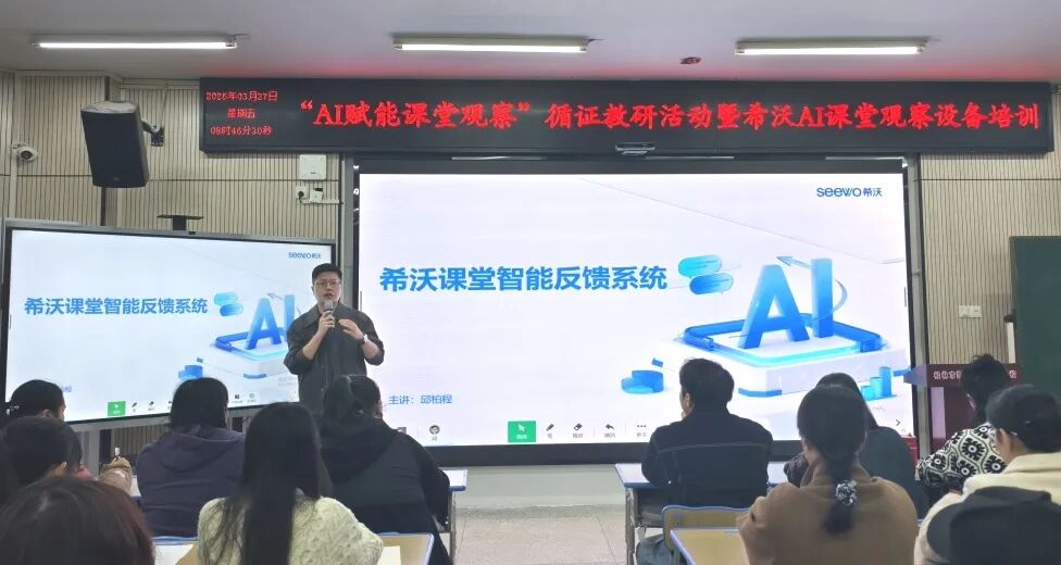 上午8时30分,活动正式开始。希沃培训讲师邱柏程围绕AI课堂观察系统设备应用开展专题培训,现场展示了AI课堂分析报告的导出与整体架构,详细讲解了系统核心功能、课堂行为数据采集逻辑及操作流程,并介绍了希沃自主研发的教育垂类大模型的技术背景。培训内容详实、案例生动,为后续实践应用奠定扎实技术基础。