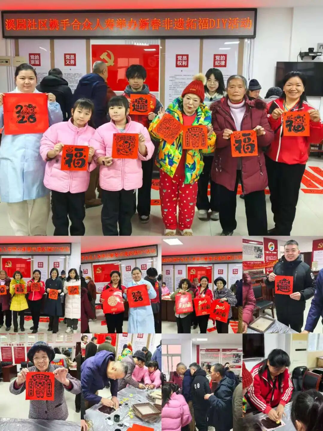 为大力弘扬中华优秀传统文化,丰富辖区居民的精神文化生活,营造喜庆祥和的新春氛围,在马年春节即将来临之际,溪园社区新时代文明实践站携手合众人寿保险公司,开展“新春非遗拓福DIY”主题活动,邀请辖区居民共赴一场非遗文化之约,亲手拓印福气,喜迎新春佳节。
