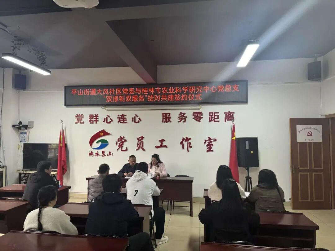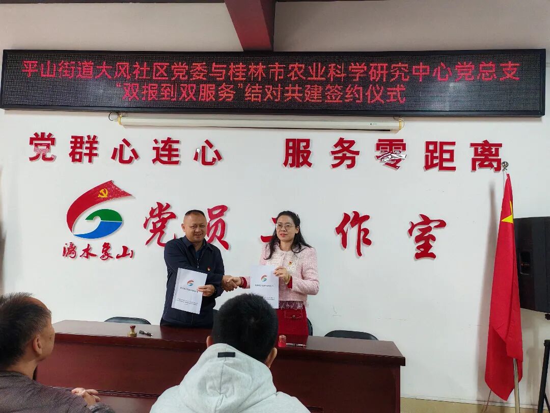 为深入推进“双报到双服务”工作,强化党建引领基层治理,实现资源共享、优势互补,4月2日上午,平山街道大风山社区党委与桂林市农业科学研究中心党总支举行结对共建签约仪式。